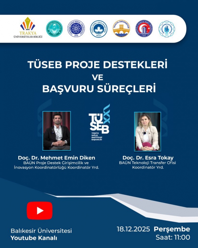 Trakya Üniversiteler Birliği (TÜB) iş birliğiyle düzenlenen “TÜSEB Proje Destekleri ve Başvuru Süreçleri” başlıklı çevrim içi etkinlik, 18 Aralık 2025 Perşembe günü saat 11.00’de gerçekleştirilecek. Etkinlik, Balıkesir Üniversitesi YouTube Kanalı üzerinden canlı olarak yayınlanacak.