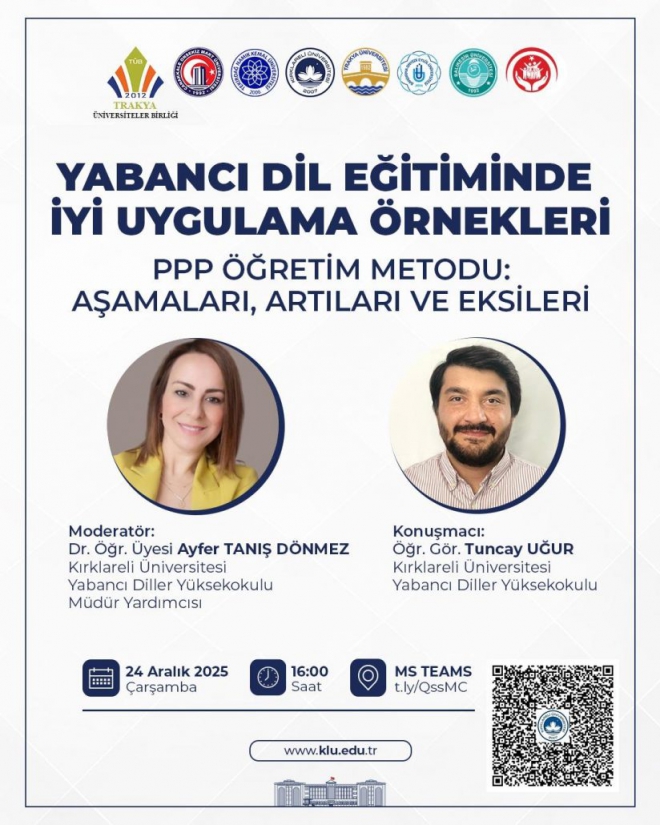 Etkinliğin moderatörlüğünü Kırklareli Üniversitesi Yabancı Diller Yüksekokulu Müdür Yardımcısı Dr. Öğr. Üyesi Ayfer Tanış Dönmez üstlenirken, konuşmacı olarak Kırklareli Üniversitesi Yabancı Diller Yüksekokulu Öğr. Gör. Tuncay Uğur yer alacak.