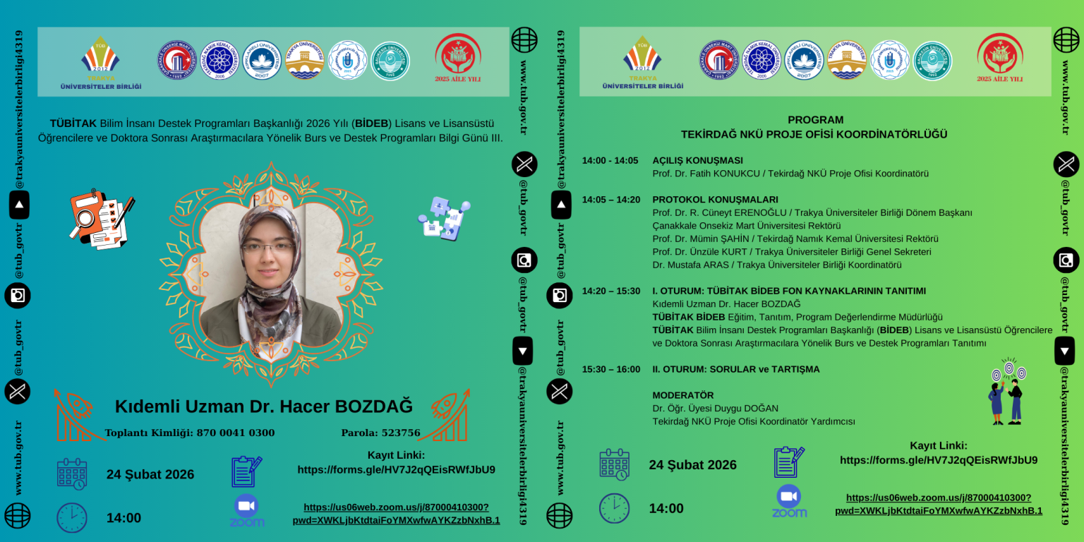 Trakya Üniversiteler Birliği (TÜB) koordinasyonunda ve Tekirdağ Namık Kemal Üniversitesi Proje Ofisi Koordinatörlüğü ev sahipliğinde, “TÜBİTAK Bilim İnsanı Destek Programları Başkanlığı (BİDEB) 2026 Yılı Lisans ve Lisansüstü Öğrencilere ve Doktora Sonrası Araştırmacılara Yönelik Burs ve Destek Programları Bilgi Günü III” programı 24 Şubat 2026 tarihinde gerçekleştirilecektir.