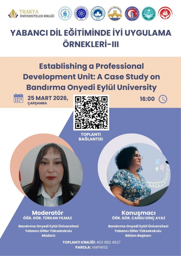 25 Mart 2026 Çarşamba günü saat 16.00’da yapılacak etkinlikte, Bandırma Onyedi Eylül Üniversitesi’nde yürütülen akademik çalışmalar odağa alınacak. “Establishing a Professional Development Unit: A Case Study on Bandırma Onyedi Eylül University” başlıklı sunumda, yükseköğretimde yabancı dil eğitiminin niteliğini artırmaya yönelik kurumsal yapılanmalar ve iyi uygulama örnekleri ele alınacak.